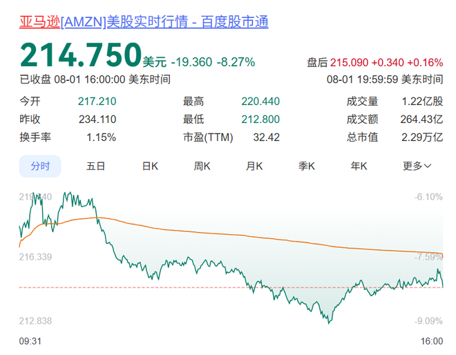 亚马逊收跌超8%,市值蒸发2000亿美元 访客 2025-08-02 16:31:42 37836 抢沙发 默认 美东时间8月1日美股收盘,亚马逊收跌8.27%,总市值2.29万亿美元,市值蒸发2000亿美金。 标签: 美东 日美 海报 阅读 QQ 分享 微博分享 微信分享 分享 上一篇新东方2025财年第四季度净营收12.43亿美元,净利润同比下跌73.7% 下一篇万达电影:持股5%以上股东拟减持不超过2%公司股份 新东方2025财年第四季度净营收12.43亿美元,净利润同比下跌73.7%上一篇 万达电影:持股5%以上股东拟减持不超过2%公司股份下一篇 相关推荐 美东日美 马斯克身家突破6000亿美元大关 2025-12-16 日产汽车遭奔驰清仓式抛售 2025-08-28 驻日美军首次向外转移 搬迁正式开始 2024-12-31 民调:超六成日本人“担心”特朗普 日美看法差异明显 2024-12-22 发表评论取消回复 快捷回复: 评论列表 (暂无评论,37836人围观)参与讨论 还没有评论,来说两句吧...