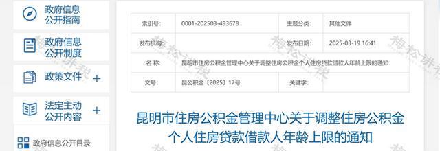 昆明市住房公积金管理中心发布《关于调整住房公积金个人住房贷款借款人年龄上限的通知》。该通知自2025年3月24日起执行。