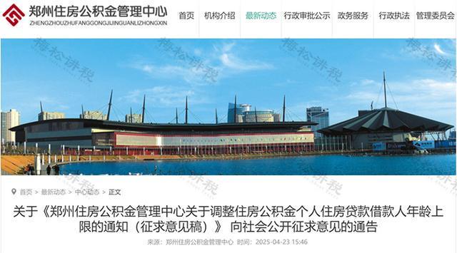 郑州住房公积金管理中心发布通告,就调整住房公积金个人住房贷款借款人年龄上限向社会公开征求意见。本次意见征集时间为2025年4月23日至2025年5月6日。