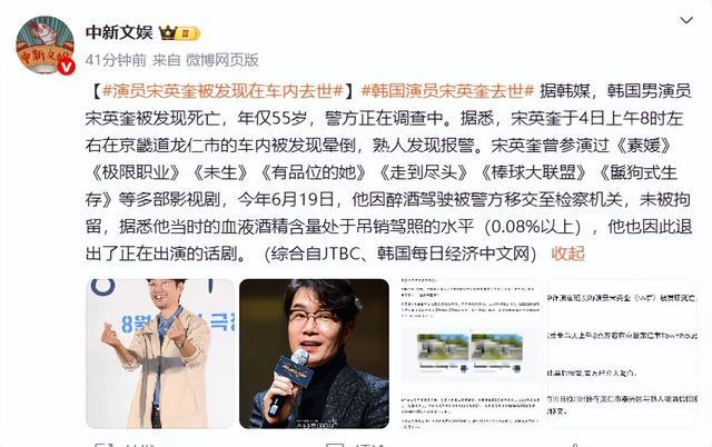8月4日,据中新文娱报道,韩国知名绿叶演员宋英奎被发现死亡,年仅55岁。
