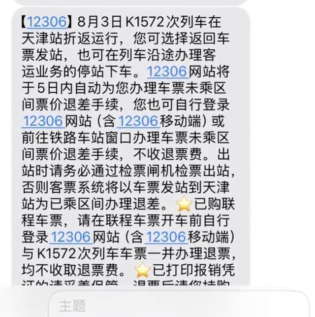 张先生提供的12306短信显示,3日K1572次列车在天津站折返运行,乘客可选择返回车票发站,也可在列车沿途办理客运业务的停站下车。12306网站将于5日内自动办理车票未乘区间票价退差手续,不收取退票费。