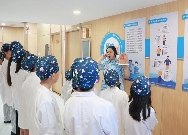 工作人员用通俗易懂的语言为孩子们解释了"经络相通"的原理,医生现场演示耳穴按摩,讲解中医如何调理耳鼻喉健康。孩子们探着小脑袋,学习的格外认真。
