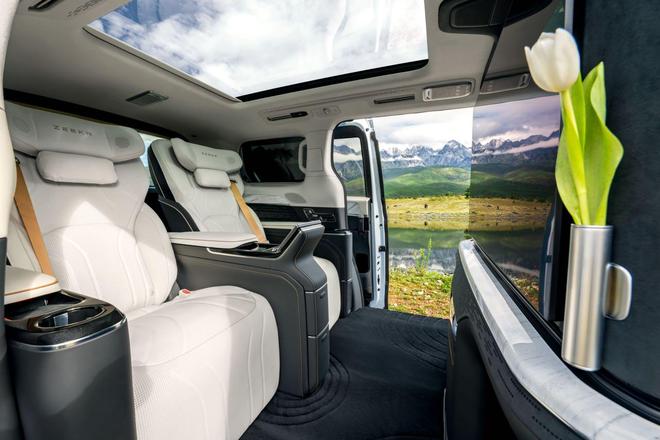 车辆座椅采用与劳斯莱斯同源的超柔苯胺真皮行政座椅,具备人体工学支撑、20点位按摩功能及覆盖全身7大区域的座椅加热功能。此外,43英寸mini LED智慧屏、31扬声器高级音响系统、18升冷热智能冰箱、香氛系统及金属玄关花瓶等配置,营造出豪华出行体验。