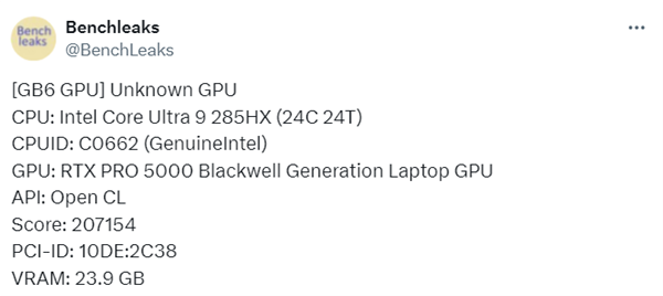 8月7日消息,Benchleaks近日发现了NVIDIA RTX Pro 5000 Blackwell移动版显卡的首个基准测试结果,这款显卡出现在戴尔Pro Max 18 Plus移动工作站中,与英特尔酷睿Ultra 9 285HX处理器搭配使用。