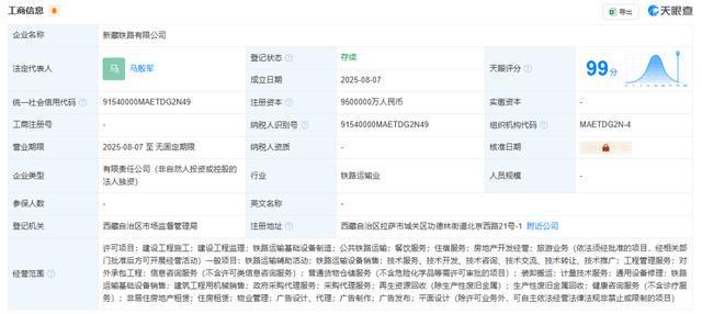 天眼查工商信息显示,近日,新藏铁路有限公司成立,法定代表人为马殷军,注册资本950亿人民币,经营范围含建设工程施工、建设工程监理、铁路运输基础设备制造、公共铁路运输、餐饮服务、住宿服务、房地产开发经营、旅游业务、工程管理服务、对外承包工程、信息咨询服务等。
