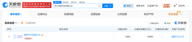天眼查工商信息显示,近日,浙江凌舒科技有限公司成立,法定代表人为曹力,注册资本1亿人民币,经营范围含汽车零部件及配件制造、汽车零部件研发、汽车零配件零售、汽车零配件批发、塑料制品制造、塑料制品销售、普通货物仓储服务等。股东信息显示,该公司由零跑汽车有限公司全资持股。