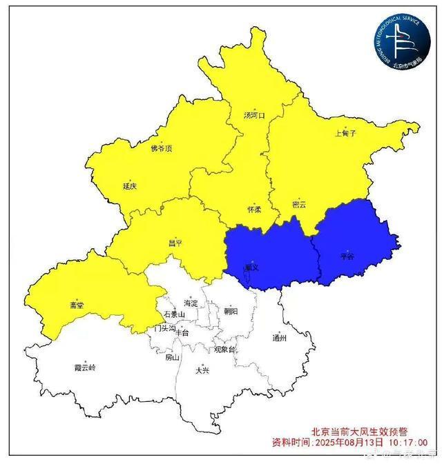 顺义、平谷、密云区分别发布雷电和大风预警信号,目前共七区雷电黄色预警中、五区大风黄色、两区大风蓝色预警中。