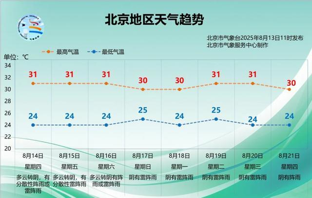 未来几天,北京仍以多云天气为主,雷阵雨频繁,其中14日至15日:多分散性雷阵雨,西部、北部降雨较明显,局地可能伴随短时大风等强对流天气。