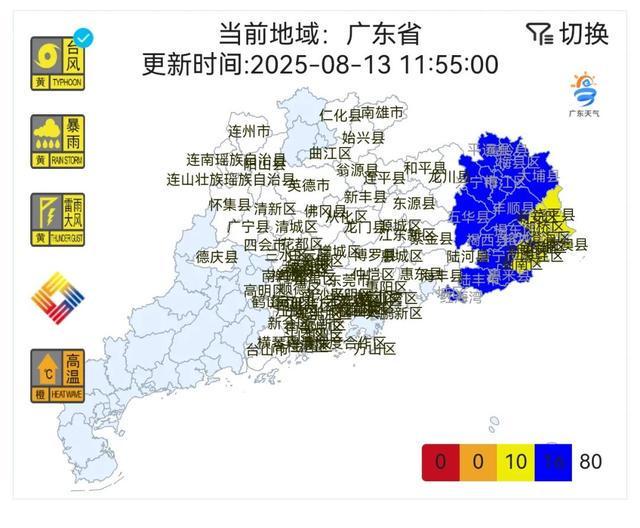 截止到13日11时,广东发布了10个台风黄色预警,16个台风蓝色预警和80个台风白色预警