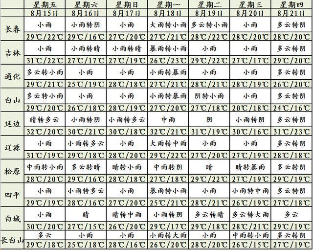 明天白天,全省多云有时阴,白城、松原、长春、四平有小到中雨,部分地方有大雨,辽源西部、吉林、通化北部、白山北部有阵雨或雷阵雨。