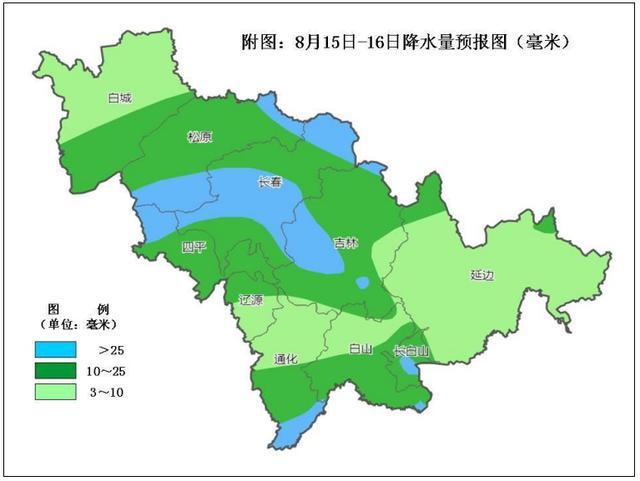 预计8月15—16日,吉林省自西向东将出现分布不均的雷雨天气,部分地方伴有短时强降水、雷暴大风或小冰雹等强对流天气。强对流天气主要集中在15日午后到夜间。过程降雨量:白城南部、松原、长春、四平、辽源北部、吉林大部、通化南部、白山南部、延边西北部、长白山保护开发区有中雨,部分地方有大到暴雨,过程降水量为10~25毫米,部分地方可达45毫米左右,最大小时雨强为20~30毫米;其他大部地区有阵雨或雷阵雨,过程降水量为3~10毫米。
