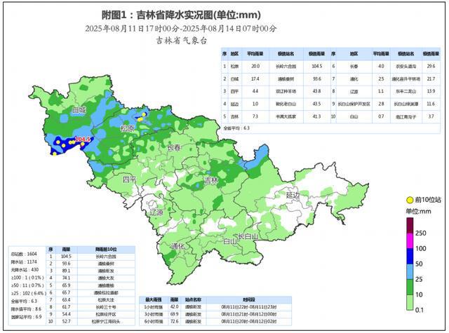 8月11日傍晚开始吉林省出现分布不均的雷雨天气,其中11—12日中西部部分乡镇出现大到暴雨,13日北部部分乡镇出现中到大雨。截至8月14日07时,全省平均降水量6.3毫米。