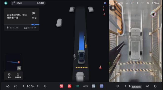 OTA 3.3版本支持从地下车库闸机到路面通勤的连续辅助操作。地库通行方面,系统可在NOA模式下自动识别闸机杆,实现车辆自抬杆通行,减少驾驶员操作步骤。