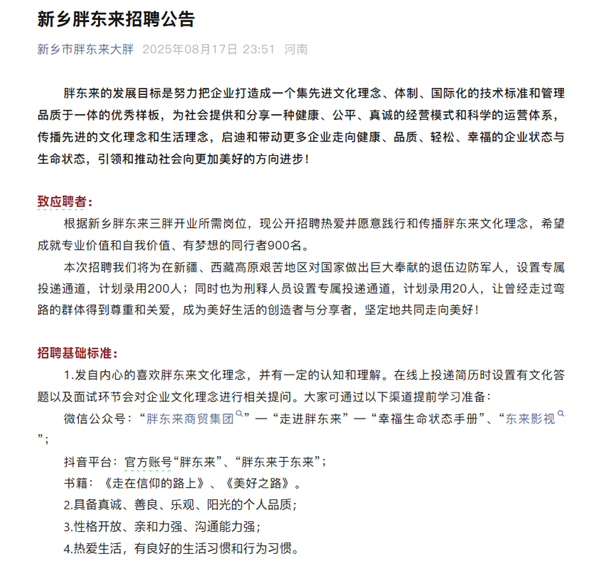 8月18日消息,新乡胖东来官方通过公户号发布了招聘公告,公开招聘同行者900名。