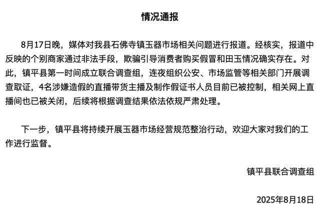 8月17日晚,媒体对我县石佛寺镇玉器市场相关问题进行报道。经核实,报道中反映的个别商家通过非法手段,欺骗引导消费者购买假冒和田玉情况确实存在。对此,镇平县第一时间成立联合调查组,连夜组织公安、市场监管等相关部门开展调查取证,4名涉嫌造假的直播带货主播及制作假证书人员目前已被控制,相关网上直播间也已被关闭,后续将根据调查结果依法依规严肃处理。