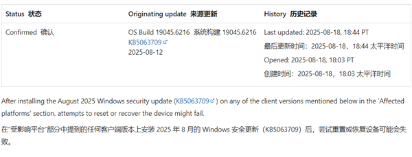 微软最新指出,受影响的Windows版本在安装2025年8月的Windows安全更新(KB5063709)后,尝试重置或恢复设备可能会失败。