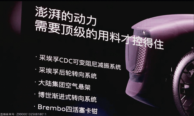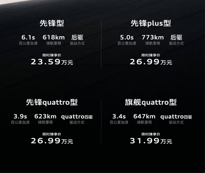 电池容量为100千瓦时三元锂电池,支持800伏高压充电技术,CLTC工况下的续航里程773公里,且充电10分钟即可增加370公里续航里程,满足长途驾驶需求。新车还配备了空气悬架、渐进式前轮转向、全轮转向等高端配置,进一步提升了车辆的操控性和舒适性。后轮转向技术让这台近5米长的车型在小巷中转弯半径仅5.6米。