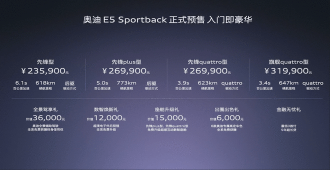 整体而言,奥迪E5 Sportback是奥迪百年来第一款完全中国创新,采用中国本土定义和本土智能化技术赋能的车型,不仅在豪华调性上毫不妥协,科幻的设计、上乘的质感、强悍的性能,以及第一梯队的智能配置。价格上23.59万元的预售价也给足了诚意。这样的组合,你会买单吗?