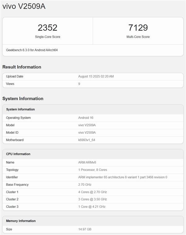综合已知信息,天玑9500采用了全新的“全大核”设计,由1颗主频高达4.21GHz的Travis超大核、3颗主频3.50GHz的Alto大核以及4颗主频2.7GHz的Gelas大核组成。