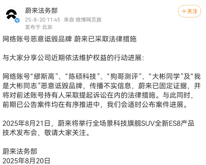 8月20日,蔚来法务部发布公告称,网络账号“繆斯高”“陈硕科技”“狗哥测评”“大彬同学”及“我是大彬同志”恶意诋毁蔚来品牌并传播不实信息。蔚来已固定相关证据,并将对这些账号持有人采取包括提起诉讼在内的法律措施。此前,鸿蒙智行法务官方微博于3月11日宣布正式起诉自媒体“我是大彬同志”,因其发布不实及侮辱性言论造谣诋毁鸿蒙智行品牌及产品。蔚来法务部表示,前期已公告案件均在有序推进中,会适时公布案件进展。此外,2025年8月21日,蔚来将举行全场景科技旗舰SUV全新ES8产品技术发布会。