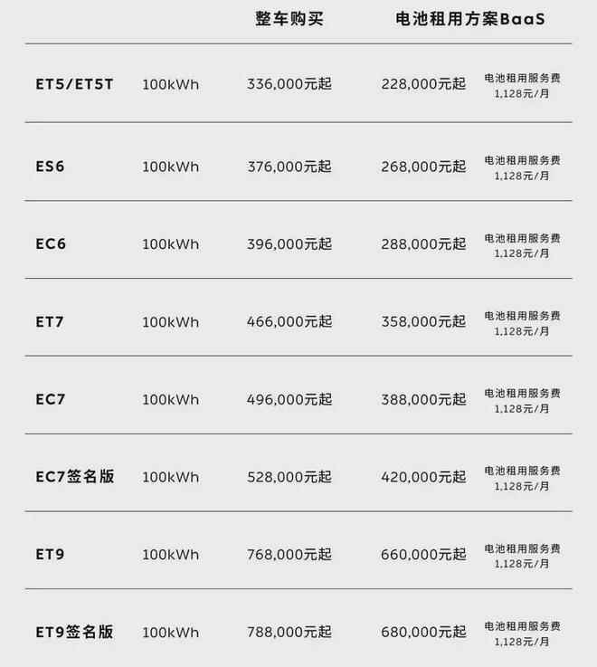 选择 BaaS 购买的用户,电池租用服务费维持原有标准:75kWh 标准电池包728元 / 月,100kWh 长续航电池包1,128元 / 月。