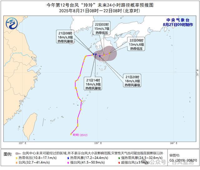 8月21日08时,今年第12号台风“玲玲”的中心位于北纬32.1度,东经129.4度(距离日本鹿儿岛西偏北方向约125公里),中心附近最大风速18米/秒(8级风,热带风暴级),中心最低气压1000百帕。