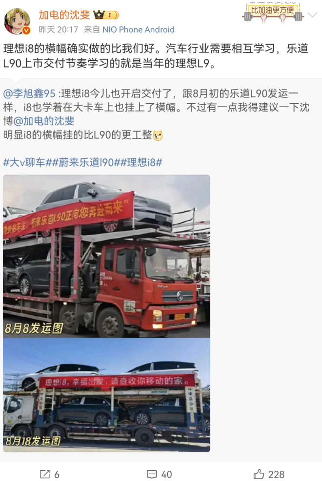 8月20日,蔚来高级副总裁兼乐道汽车总裁沈斐转发了一名网友发布的微博。微博内容是乐道L90和理想i8在卡车上挂横幅的对比。