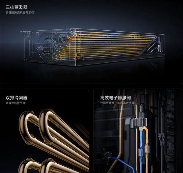 标配双排冷凝器+三排蒸发器,搭配电子膨胀阀,大幅提升换热效率,减少能量损耗。