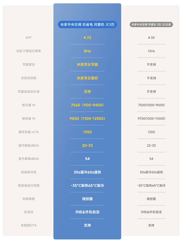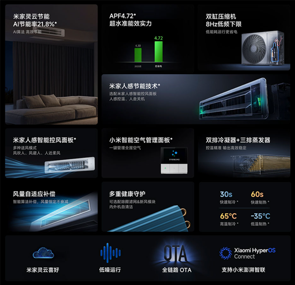 官方称新品极致省电,拥有新一级能效,APF 4.72,全年省电约1072元;支持自研米家灵云节能算法,AI节能率21.8%。