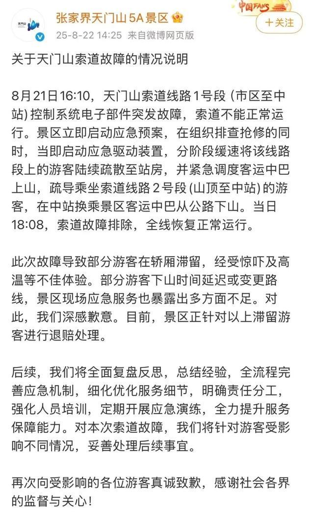 张家界天门山景区发布索道故障情况说明:深感歉意,正针对滞留游客进行退赔处理