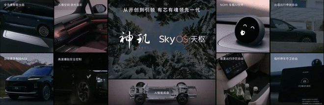 内饰采用环抱式座舱布局,配备 Skyline 天际线贯穿屏与15.6英寸 AMOLED 中控屏,并搭载自研的 SkyOS・天枢全域操作系统,支持智驾、互联等多模块功能。