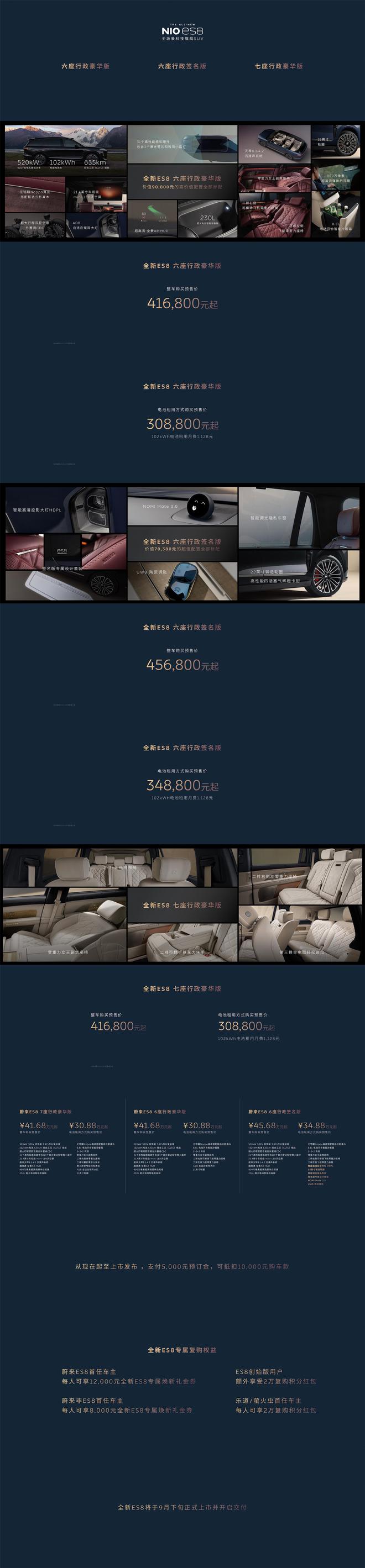 8月21日报道为了全新的ES8,李斌又一个人撑了3个小时。这台蔚来旗下备受瞩目的全新豪华纯电SUV终于迎来预售,新车基于新一代NT3.0平台打造,正式从中大型SUV升格为大型SUV。全新的ES8可以说是得到了全方位升级,此次预售分为六座行政签名版(预售价45.68万元起,Baas方案34.88万元起)、六座行政豪华版(预售价41.68万元起,Baas方案30.88万元起)和七座行政豪华版(预售价41.68万元起、Baas方案30.88万元)三个版型,并计划在9月下旬正式上市,并开启交付。