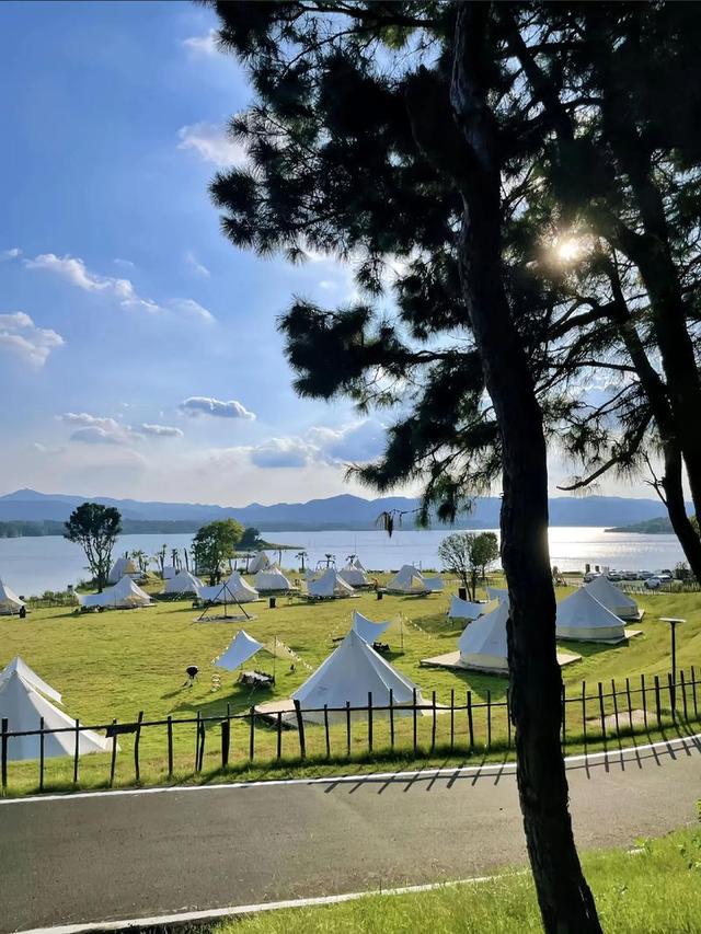 浉河之畔的孔雀岛露营基地,让人近距离感受晚风与夕阳,在放慢的节奏中感受生活的美好。