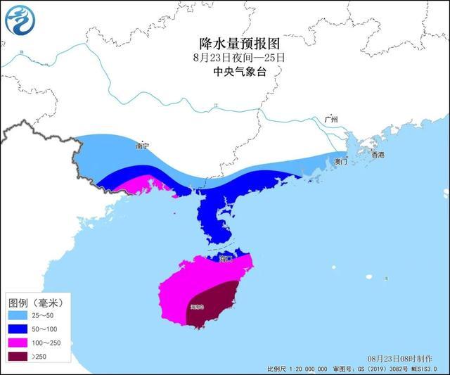 降雨预报:预计23日夜间至25日,广东西南部、广西南部和海南岛有大到暴雨;海南岛部分地区、广西南部沿海有大暴雨、海南岛中南部局地特大暴雨,上述部分地区累计雨量100~200毫米、局地300~400毫米;并伴有短时强降水(最大小时雨量30~50毫米,局地可达80毫米以上)、雷暴大风等强对流天气。降雨主要影响时段为24日。