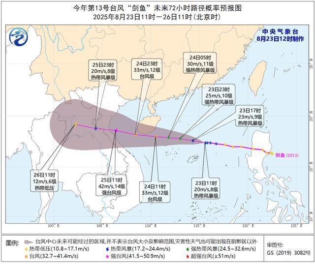 预计,“剑鱼”将以每小时25公里左右的速度向西偏北方向移动,逐渐趋向海南岛南部沿海,强度明显加强,最大强度可达台风级到强台风级(13~14级,38~45米/秒),将于24日傍晚前后擦过或登陆海南岛南部沿海;25日上午逐渐趋向越南中北部沿海。