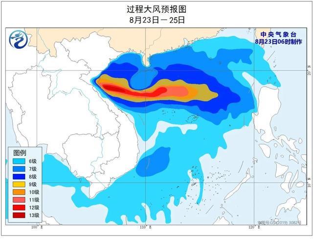 大风预报:预计23日至25日,南海大部、巴士海峡、黄岩岛附近海域、西沙群岛、中沙群岛、琼州海峡、北部湾、广东沿海、广西沿海、海南岛将有6~8级大风,南海中北部部分海域、海南岛沿海及近海、北部湾中南部海域风力有9~10级,台风中心经过的附近海域或地区风力可达11~14级、阵风15~16级。