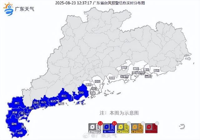 ️广东省气象台预计,8月24-25日,雷州半岛有大雨到暴雨局部大暴雨并伴有7-10级阵风;茂名、阳江和江门三市的沿海县(区)和海岛有大雨局部暴雨并伴有6-8级阵风。8月23-24日,广东中北部的部分市县有35-37℃的高温天气。