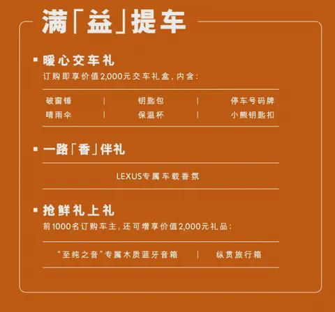 在活动期间购买新款雷克萨斯NX的用户可享:价值2000元专属交车礼,雷克萨斯专属车载香氛;前1000名订购车主更可尊享额外价值2000元专属礼品。