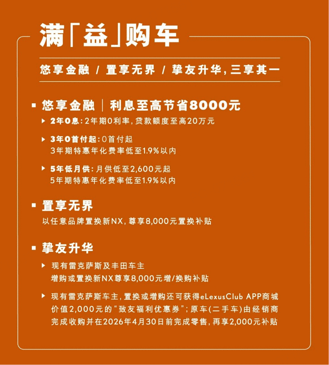 在8月23日—10月31日期间下订新款雷克萨斯NX的用户可享:2年0息、3年0首付起、5年低月供,至高节省利息8000元;置享无界,全品牌车型置换新NX即可尊享8000元补贴;挚友升华,现有雷克萨斯及丰田车主增/换购新NX均可尊享8000元补贴,其中雷克萨斯车主还可额外获得更多专属权益。