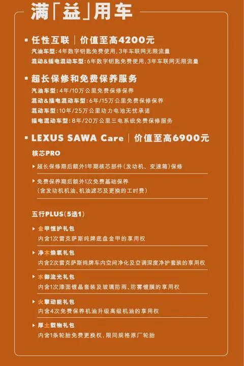 此外,购买新款雷克萨斯NX的消费者还可享:4年或6年数字钥匙免费使用+3年车联网流量,价值至高4200元。同时,汽油车型享受4年/10万公里、混动/插电混动车型享受6年/15万公里免费保修保养。其中混动车型额外享受10年/25万公里动力电池无忧承诺,插电混动车型额外享受8年/20万公里三电系统免费保修服务。除此之外,用户还可获赠价值至高6900元的LEXUS SAWA Care(Service Activated Warranty)礼包,涵盖发动机和变速箱1年延保、免费保养期后额外1次免费基础保养,以及金木水火土五行PLUS五选一关怀礼包。
