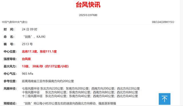 预计,“剑鱼”最强可达强台风级(14~15级,42~48米/秒),并将于24日下午至傍晚在海南陵水到乐东一带沿海登陆(13~14级,40~45米/秒,台风级或强台风级),也有可能经过海南岛南部近岸海面,然后逐渐趋向越南中北部沿海。