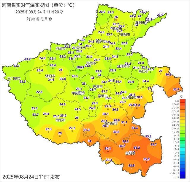 受降水和冷空气的影响,今天11时20分,除东南部部分地区仍有35℃+的高温天气外,全省大部地区气温降至25℃上下。