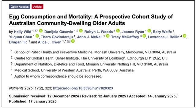 2025年1月17日,发表在《营养素》上的一项研究显示,每周吃1~6个鸡蛋,有助于延长老年人寿命并降低心血管疾病死亡风险。