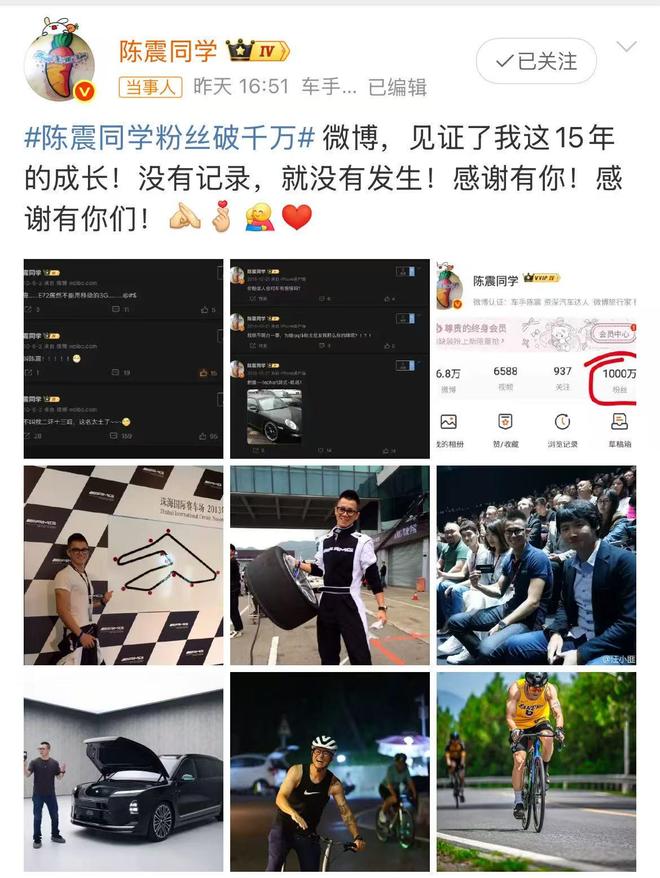 微博汽车领域首位,陈震官宣微博粉丝破千万