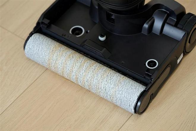 取下水箱后,就可以看到石头智能洗地机A30 Pro Ultra清扫整个房间后的滚刷,由于我们使用中多次喷射泡沫强化清扫效果,滚刷上酱料留下的污渍已经被清洗掉不少了,只剩下一些轻微的污渍痕迹。