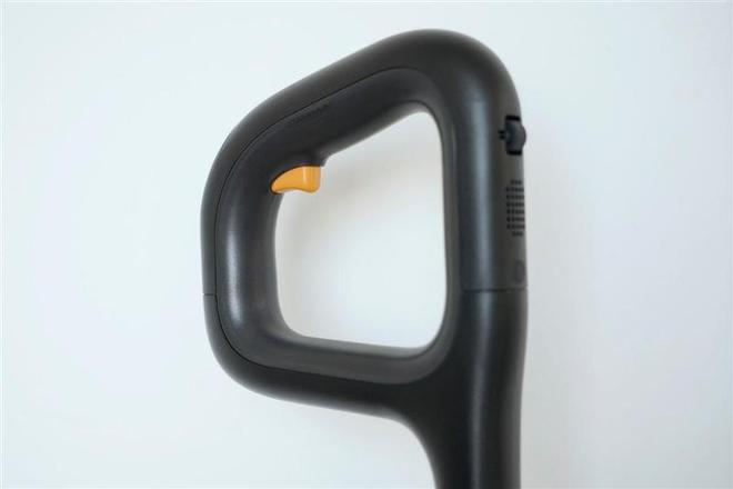 石头智能洗地机A30 Pro Ultra的控制手柄,正面有三个按钮,上方两个分别是清洁模式切换键和启动/停止按钮,下方是自清洁启动/停止按钮,控制手柄内还有一个橘色的扳机开关,用于可以控制新增的清洁泡沫喷射。
