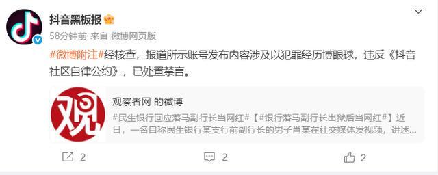 抖音回应落马副行长当网红:以犯罪经历博眼球,已被禁言