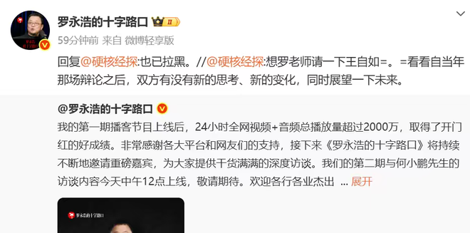 有网友建议罗永浩邀请俞敏洪和王自如,但罗永浩转发并评论称“已经拉黑”。