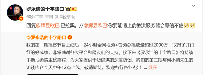 8月26日,罗永浩主持的第一期博客节目上线后反响强烈,24小时全网视频加音频总播放量超过2000万。罗永浩称接下来将持续邀请重磅嘉宾,第二期与何小鹏的访谈内容将于8月26日中午12点上线。