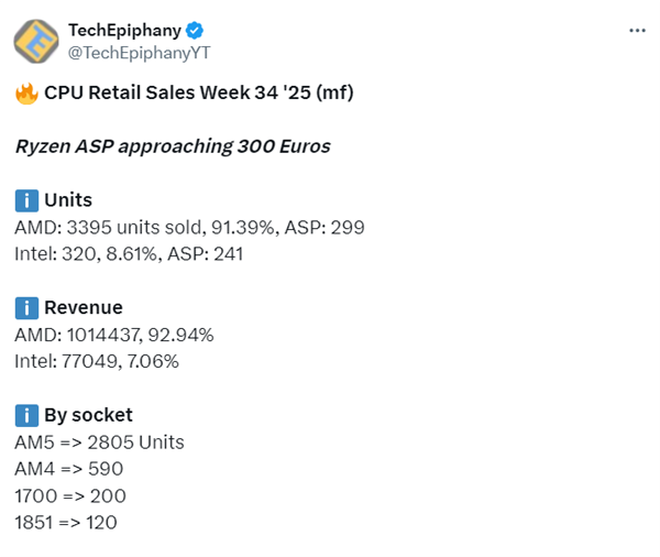X3D占比过半卖疯了!AMD CPU占德国Mindfactory周销量93.39%:Intel仅剩8.61%